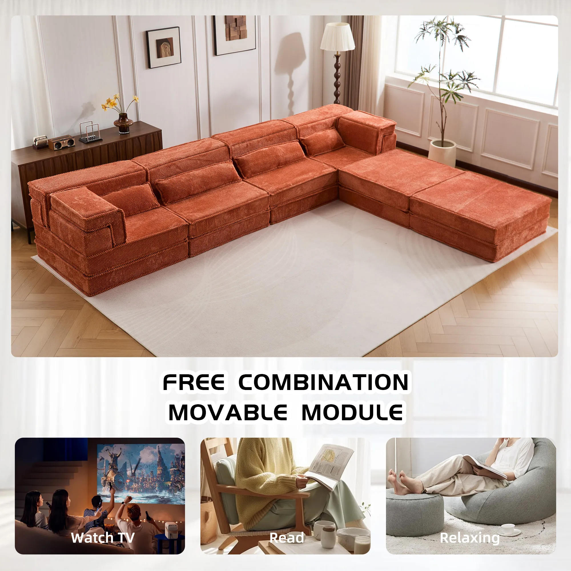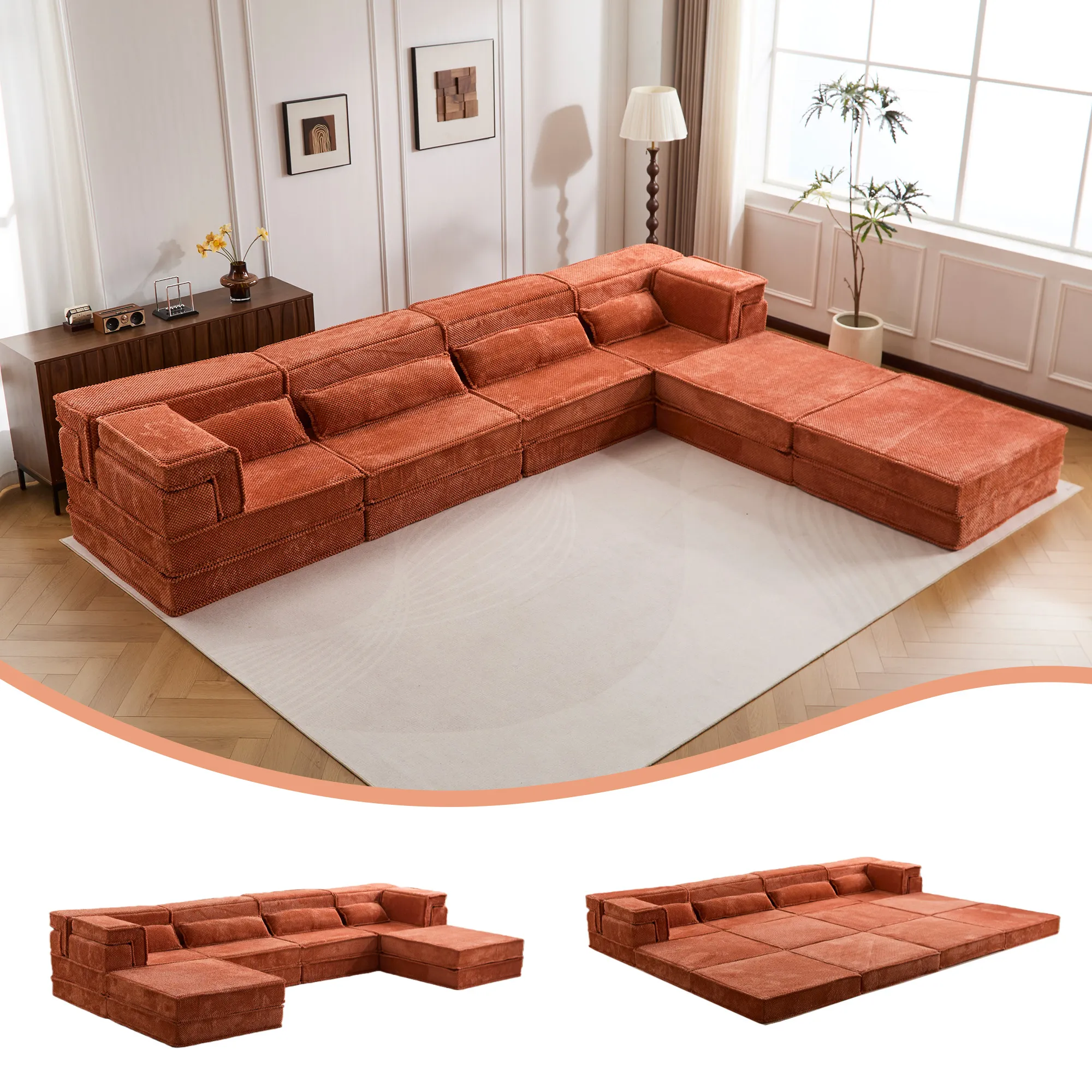 Product Name:Compression Mahjong Sofa,Convertible Floor Sofa Bed,DIY Boneless Modular Sectional Sofa,No Assembly Required,Circle fleece fabric,Oversized 4 Seater with 2 Ottoman,Orange
