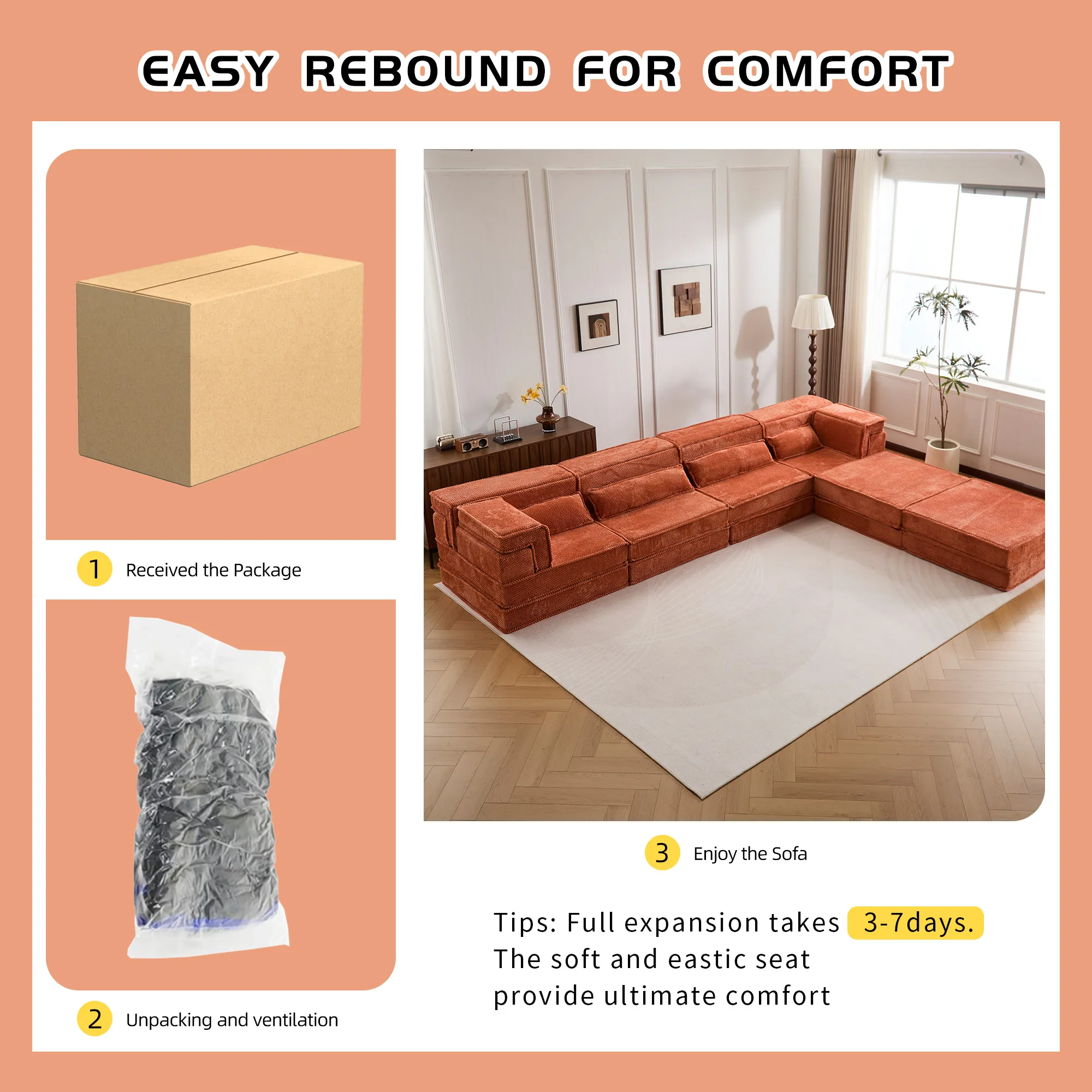 • 【No Assembly Required & Tips】The Convertible Modular Sectional mahjong sofa don’t need to assemble. Tips: It takes time for the sofa to expand, Please unpack and wait 48-72 hours for full rebound.